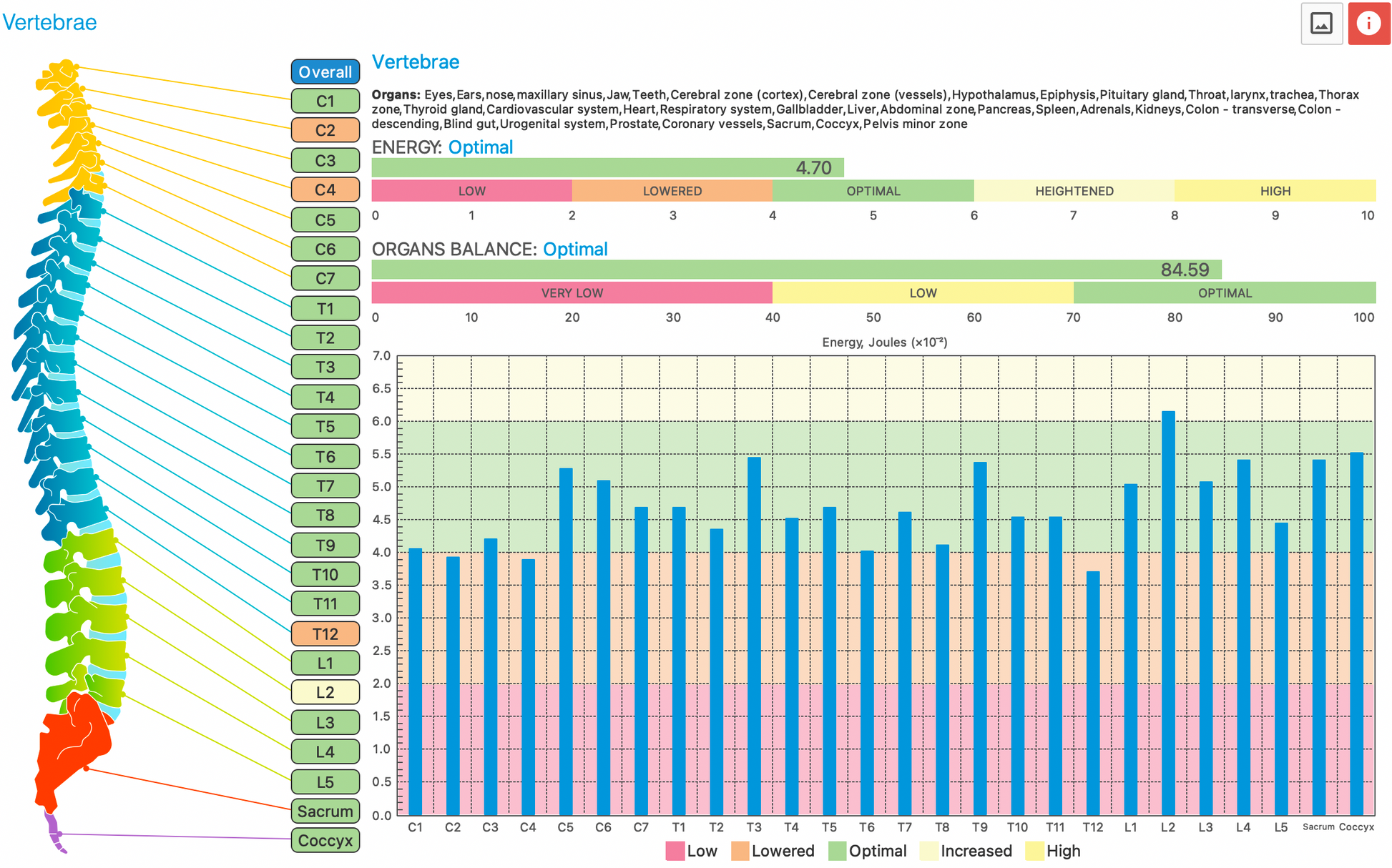 Intuitive Color-Coding: Quickly identify areas of concern with a simple, color-coded system that highlights regions of energy depletion or excess along the spine.